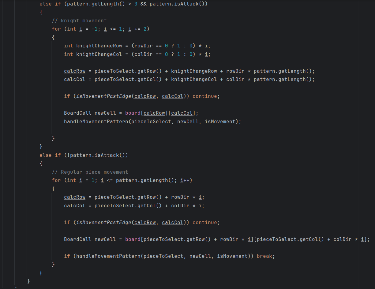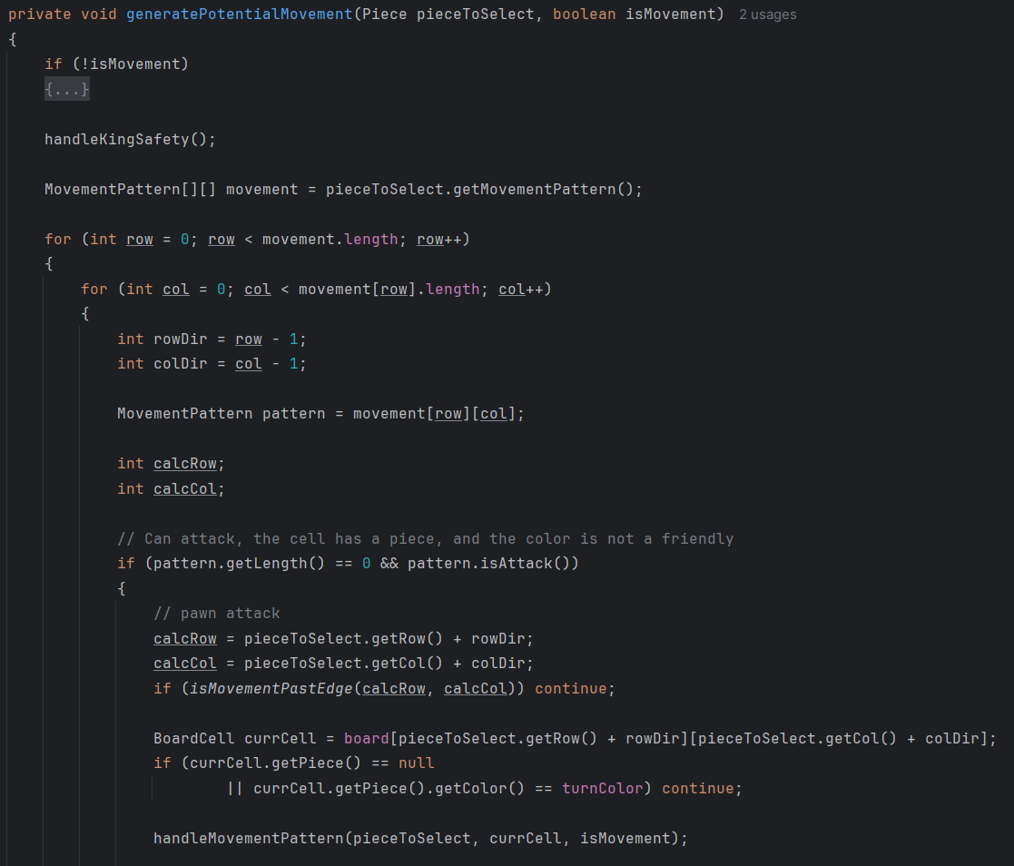 When I began designing my pieces, a difficult challenge was the movement of all the pieces and how to store them. Each piece moves similarly but differently, and I wanted one method to execute that movement. I was stuck on this for more than three hours, and didn’t know what to do. But fortunately, after a 5-minute rest away from computers, I came up with an amazing idea. Each piece will store a 2D, 3×3 array of objects from the MovementPattern class. This class stores two things: a special movement boolean and a length. The indices of the position in the 2D array determine direction on the board, and the length is how far the piece can move. The only problem I came up with for this was the knight, for which I had to add a special condition. Inside my method, I looped through the 2D array of the piece the user selected, and based on that pattern’s rules, would highlight squares the user can move to. This generates potential movement, which is later used for check and checkmate detection, for whatever piece is inputting. I wish I started off by creating how I would move each piece before getting into the logic and working sideways and backwards as I did. I would have benefitted on planning beforehand, which is a skill I struggle with. My favorite part, however, was the movement creation. It was something brand new I thought of on the spot, and I’m really proud of my idea for this. I learned how to use unique datatypes for storing what I thought wouldn’t be stored inside of them, and using every piece of data I can, the indices as directions, to my advantage.